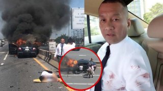 ชนสนั่นไฟลุกท่วม กลางด่วนคู่ขนานลอยฟ้า “ร้อยตำรวจเอก” ทุบกระจกช่วยชีวิต