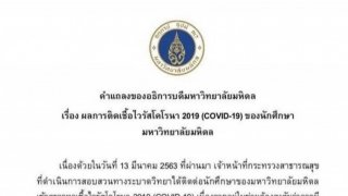 14 มี.ค. 63 - มหาวิทยาลัยมหิดล ออกแถลงการณ์ระบุพบนักศึกษาของมหาวิทยาลัยติดเชื้อไวรัสโคโรนาสายพันธุ์ใหม่ หรือโรคโควิด-19 ความว่า เนื่องด้วยในวันที่ 13 มีนาคม 2563 ที่ผ่านมา เจ้าหน้าที่กระทรวงสาธารณสุขที่ดำเนินการสอบสวนทางระบาดวิทยาได้ติดต่อนักศึกษาของมหาวิทยาลัยมหิดลเข้าตรวจหาเชื้อไวรัสโคโรนา 2019 (COVID-19) เนื่องจากอยู่ในข่ายต้องสงสัยว่ามีการสัมผัสโรคจากบุคคลที่ติดเชื้อซึ่งอยู่ภายนอกมหาวิทยา.. ดูเพิ่ม