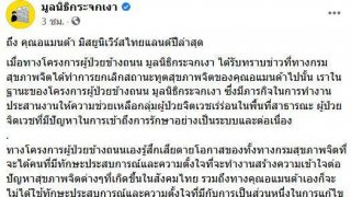 ถึง คุณอแมนด้า มิสยูนิเวิร์สไทยแลนด์ปีล่าสุด เมื่อทางโครงการผู้ป่วยข้างถนน มูลนิธิกระจกเงา ได้รับทราบข่าวที่ทางกรมสุขภาพจิตได้ทำการยกเลิกสถานะทูตสุขภาพจิตของคุณอแมนด้าไปนั้น เราในฐานะของโครงการผู้ป่วยข้างถนน มูลนิธิกระจกเงา ซึ่งมีภารกิจในการทำงานประสานงานให้ความช่วยเหลือกลุ่มผู้ป่วยจิตเวชเร่ร่อนในพื้นที่สาธารณะ ผู้ป่วยจิตเวชที่มีปัญหาในการเข้าถึงการรักษาอย่างเป็นระบบและต่อเนื่อง ทางโครงการผู้ป่วย.. ดูเพิ่ม