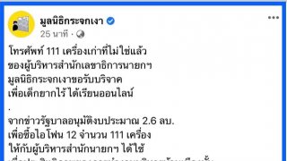 ขอบริจาคให้น้องๆได้เรียนออนไลน์! มูลนิธิกระจกเงาขอรับบริจาค โทรศัพท์ 111 เครื่องเก่าที่ไม่ใช่แล้วของผู้บริหารสำนักเลขาธิการนายกฯ "เพื่อให้เด็กยากไร้ได้เรียนออนไลน์" ขอให้เด็กๆในครอบครัวยากไร้ 111 ราย ได้มีโอกาสเข้าถึงอุปกรณ์ในการเรียน เพื่อประสิทธิภาพทางการศึกษาที่ดีขึ้น สามารถติดต่อขอบริจาคได้ที่มูลนิธิกระจกเงา ล่าสุด สำนักงานเลขาธิการนายกฯ ชี้แจงกรณี “มูลนิธิกระจกเงา” แสดงความประสงค.. ดูเพิ่ม