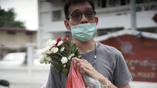"เพนกวิน" แต่งหน้า ใส่ชุดไทย ให้กำลังใจผู้ต้องหาทั้ง 2 หน้าสน.ยานนาวา