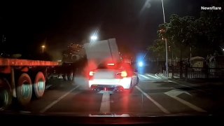น่ากลัวมาก!! แท่งคอนกรีตร่วงจากหลังรถบรรทุก ทับรถยนต์ Tesla ที่อยู่ข้างๆ เละ โชคดีคนขับไม่ได้รับบาดเจ็บ 😢