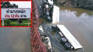เตือนแล้วบ่ฟัง!! รถพ่วง 18 ล้อดันทุรังข้ามสะพานที่ทนได้ 12 ตัน สุดท้ายสะพานพัง รถร่วงหล่นทั้งคัน