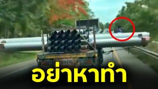 อย่าหาทำ!! รถพ่วง บรรทุกท่อเหล็ก วางแนวกล้างขวางถนนยื่นออกไปเยอะมาก แถมมีคนนั้งกินลม