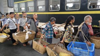 ภาพของบรรดาเกษตรกรที่หาบผลผลิตของตัวเอง เรียงแถวขึ้นรถไฟหมายเลข 8629 ซึ่งจะเดินทางจากเมืองเชินโจวไปยังตำบลไป๋ตู๋จื้อ มณฑลหูหนาน ทางตอนใต้ของประเทศจีน รถไฟขบวนนี้ไม่มีการจำหน่ายตั๋ว เพื่อให้ประชาชนสามารถขึ้นโดยสารได้ฟรี ซึ่งช่วยประหยัดเงินให้แก่บรรดาเกษตรกรเหล่านี้ไปได้ 2,000 – 3,000 หยวน (ประมาณ 9,400-14,000 บาท) ต่อปีเลยทีเดียว ดูเพิ่ม