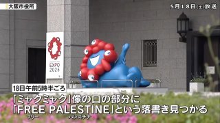 รูปปั้น "เมียคุเมียคุ" ซึ่งเป็นตัวละครอย่างเป็นทางการ ของงานเอ็กซ์โป 2025 ซึ่งตั้งอยู่หน้าศาลาว่าการโอซาก้า ถูกทำลายโดยมีข้อความ ที่ถูกพ่นสีเป็นภาษาอังกฤษว่า "ปลดปล่อยปาเลสไตน์" บนปากของรูปปั้น โดยการกระทำดังกล่าว กระตุ้นให้เมืองยื่นฟ้องประเทศปาเลสไตน์ ถึงความเสียหายดังกล่าว... เพื่อเป็นมาตรการชั่วคราว ทางเมืองได้ปิดข้อความดังกล่าว ด้วยกระดาษสีขาว และ วางแผนที่จะลบข้อความดังกล่าวออก... ดูเพิ่ม