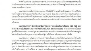 20 มีนาคม 2563 คณะกรรมการนโยบายการเงิน (กนง.) ประชุมนัดพิเศษเพื่อประเมินผลกระทบจากสถานการณ์การระบาดของโควิด-19 ต่อแนวโน้มเศรษฐกิจและกลไกการทำงานของตลาดการเงินของประเทศ โดยมีมติเป็นเอกฉันท์ให้ลดอัตราดอกเบี้ยนโยบาย 0.25% ต่อปี จาก 1.00% เป็น 0.75% ต่อปี โดยให้มีผลในวันที่ 23 มีนาคม 2563 เพื่อลดภาระดอกเบี้ยของลูกหนี้ที่ได้รับผลกระทบ บรรเทาปัญหาสภาพคล่องในตลาดการเงิน และลดผลกระทบที่เกิดขึ้นต่อเศรษฐกิ.. ดูเพิ่ม