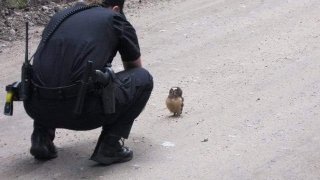 ตำรวจนั่งคุยกับลูกนกฮูกอย่างน่ารัก