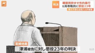อดีตพนักงานวัย 59 ปี ของโรงเรียนอาชีวะ ในจังหวัดมิยาซากิ ประเทศญี่ปุ่น ถูกศาลตัดสินจำคุก 23 ปี ฐานวางยาข่มขืน นักศึกษาสาวจำนวน 7 ราย ระหว่างเดือนกรกฎาคม 2015 ถึงเดือนมีนาคม 2023 หัวหน้าผู้พิพากษา "ฮิโรยูกิ ฟูนาโตะ" กล่าวว่า "จำเลยใช้ประโยชน์ จากความไว้วางใจ ที่เหยื่อมีต่อเขา และ ก่ออาชญากรรม ที่ไตร่ตรองไว้ล่วงหน้าแล้ว" ดูเพิ่ม