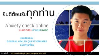 General Health Questionnaire - กรมสุขภาพจิต กระทรวงสาธารณสุข กดตรงนี้ https://www.idrlabs.com/th/anxiety-stress-depression/test.php เป็นสถาวะทางอารณ์ของบุคคลที่มีความรู้สึกว่า หวาดหวั่น หวาดหลัว อึดอัด ไม่สบายใจ เกรงว่าจะมีสิ่งร้ายหรือเหตุการณ์ที่ไม่ดีเกิดขึ้นกับตน ลักษณะของความวิตกกังวล ประกอบด้วย- ความรู้สึกหงุดหงิดไม่สบายในสภาพการณ์ที่ไม่แน่ใจ- ความรู้สึกหวาดหวั่น หวั่นเกรงจะมีเหตุร้ายเกิดขึ้น.. ดูเพิ่ม
