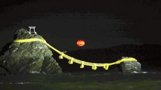 "เมโอโตะอิวะ" หรือที่รู้จักกันในชื่อ "หินแต่งงาน หรือ หินคู่รัก" หนังสือพิมพ์ "โยะมิอุริชิมบุง" ระบุว่า "พระจันทร์เต็มดวง สีแดงที่สวยงาม สามารถมองเห็นได้ง่าย โดยที่พระจันทร์ขึ้นมาระหว่าง "เมโอโตะอิวะ" ขึ้นมาจากศาลเจ้า "ฟุมิทามิ โอกิทามะ" เวลาประมาณ 18:50 น. ดวงจันทร์โผล่ขึ้นมาจากก้อนเมฆ แสงของมันได้ส่องสว่าง ที่พื่นผิวน้ำทะเล มีผู้เยี่ยมชมประมาณ 20 คน เฝ้าดูพระจันทร์อย่างเงียบๆ เราสามารถมองเห็นพร.. ดูเพิ่ม