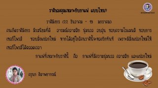 ราศีมังกร (22 ธันวาคม - 19 มกราคม)คนเกิดราศีมังกร มีรสนิยมที่ดี อารมณ์คลาสสิก นุ่มนวล อบอุ่น ชอบความโรแมนติ ชอบการเซอร์ไพรส์ ชอบสิ่งแปลกใหม่ หากได้อยู่ใกล้คนราศีนี้จะหลงรักทันที เพราะมีสิ่งแปลกใหม่ให้เซอร์ไพรส์ได้ตลอดเวลา กาแฟที่เหมาะกับราศีนี้ คือ กาแฟที่มีความนุ่มนวล คลาสสิก และแปลกใหม่ ราศีกุมภ์ (20 มกราคม – 18 กุมภาพันธ์ )คนที่เกิดราศีกุมภ์ มีความคิดสร้างสรรค์ สร้างสิ่งต่างๆ ชอบทดลอง มีความละ.. ดูเพิ่ม