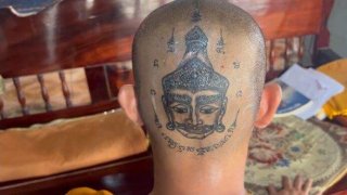 พระโหลยโท่ย! หลวงพี่ให้ฆราวาสสักรูปยักษ์กลางหัว บวชเสียข้าวสาร