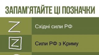 รวมสัญลักษณ์ในสงครามรัสเซียยูเครน และ นี่ก็คือความหมายของสัญลักษณ์ในรูป * Z = กองกำลังตะวันออกของรัสเซีย * Z ในกรอบสี่เหลี่ยม = กองกำลังรัสเซีย จากสาธารณรัฐไครเมีย * O = กองกำลังติดอาวุธ ของเบลารุส * V = นาวิกโยธิน ของรัสเซีย * X = ชาวเชเชน * A = กองกำลังพิเศษ * รูปฮ. = สีเทาเป็นของรัสเซีย / สีเขียวหรือน้ำเงิน เป็นของยูเครน ดูเพิ่ม