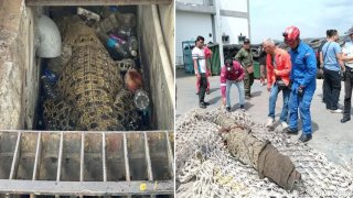 มาเลช่วยจระเข้ตัวใหญ่ติดอยู่ในกองขยะในท่อระบายน้ำ