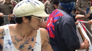 ด่วน เอมมี่ เดอะบอททอมบลูส์ ศิลปินนักร้อง สาดถังสีใส่ตำรวจ สน.สำราญราษฎร์