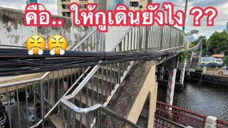 จะให้เดินกันยังไง!!? สายสื่อสาร สายไฟฟ้า ลอดผ่านสะพานลอยแบบนี้