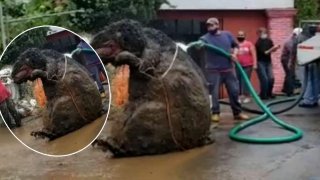 เจ้าหน้าที่กู้ภัยเร่งช่วย "คาปิบารา" ติดอยู่ในท่อริมถนน