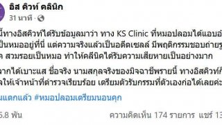 ล่าสุด เพจ อิส คิวท์ คลินิก แจ้งว่า ตอนนี้ทางอิสคิวท์ได้รับข้อมูลมาว่า ทาง KS Clinic ที่หมอปลอมได้แอบอ้างว่าเคยเป็นหมออยู่ที่นี่ แต่ความจริงแล้วเป็นอดีตเซลล์ มีพฤติกรรมชอบถ่ายรูปในคลีนิค สวมรอยเป็นหมอ ทำให้คลีนิคได้รับความเสียหายเป็นอย่างมาก ตอนนี้ทางอิสคิวท์ได้รับข้อมูลมาว่า ทาง KS Clinic ที่หมอปลอมได้แอบอ้างว่าเคยเป็นหมออยู่ที่นี่ แต่ความจริงแล้วเป็นอดีตเซลล์ มีพฤติกรรมชอบถ่ายรูปในคลีนิค สวมรอยเ.. ดูเพิ่ม