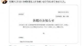 บริษัทแห่งหนึ่งในญี่ปุ่น ได้ประกาศถึงพนักงานทุกคน ให้วันศุกร์ที่ 26 ที่จะถึงนี้เป็นวันหยุดของบริษัท เพราะเกม "Monster Hunter Rise" จะวางขายในวันนั้นนั่นเอง... โดยบริษัทให้เหตุผลว่า "เกมวางขายเป็นวันแรก เหล่าพนักงานก็คงไม่มีสมาธิ ที่จะทำงานกัน แล้วคนที่อยากจะลาหยุดก็คงมีอยู่แล้ว ก็เลยประกาศหยุดให้มันจบๆไปเลย!! ดูเพิ่ม