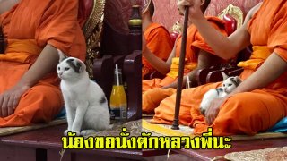 ใจละลายเเล้ว น้องเเมวนั่งบนตักหลวงพี่ฟังเทศน์ อย่างน่ารัก ไม่ดื้อไม่ซน
