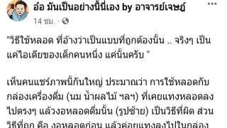 ล่าสุดนั้นทางเพจเฟสบุ๊ค อ๋อ มันเป็นอน่างนี้นี่เอง by อาจารย์เจษฏ์ ของอ.เจษฏา ท่านก็ได้ออกมาโพสแจง เกี่ยวกับประเด็นที่อ้างว่าการใช้หลอดดูด ว่าใช้ผิดวิธีกันมานาน ดังนี้... "วิธีใช้หลอด ที่อ้างว่าเป็นแบบที่ถูกต้องนั้น .. จริงๆ เป็นแค่ไอเดียของเด็กคนหนึ่ง แค่นั้นครับ " เห็นคนแชร์ภาพนี้กันใหญ่ ประมาณว่า การใช้หลอดกับกล่องเครื่องดื่ม (นม น้ำผลไม้ ฯลฯ) ที่เคยแทงหลอดลงไปตรงๆ แล้วงอหลอดดื่มนั้น (รูปซ้าย) เ.. ดูเพิ่ม