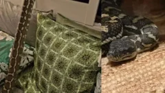 ชาวบ้านพบงูแปลกสีแดงดำโผล่ในบ้าน