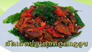 ผัดเผ็ดปลาดุกทอดกรอบ 1.ปลาดุก 200 กรัม 2.พริกแกง 60 กรัม 3.น้ำตาลทราย 3 ช้อนชา 4.น้ำปลา 2 ช้อนชา 5.น้ำมันหอย 2 ช้อนชา 6.น้ำเปล่าเล็กน้อย 7.กระชาย 8.พริกไทยอ่อน 9.ใบมะกรูด 10.ใบกะเพราทอดกรอบ 11.พริกแดงหั่นแฉลบ 12.น้ำมันสำหรับทอด วิธีทำ 1.นำปลาดุกล้างน้ำผึ่งให้สะเด็ดน้ำ นำลงทอดในน้ำมันให้เหลืองกรอบ เตรียมไว้ 2.ใส่น้ำมันผัดกับพริกแกงให้หอมเติมน้ำเปล่าเล็กน้อย ใส่กระชาย พริกไทยอ่อน พริกแกง ใบมะกรูด.. ดูเพิ่ม