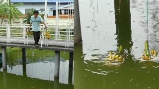 มิติใหม่แห่งการให้อาหารปลา!แขวนกล้วยลงไปทั้งเครือเลย