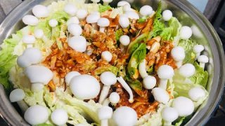 เห็ดงอกในหม้อไฟแบบเกาหลี ทำกินที่ไทยอร่อยไม่แพ้กัน(พากย์ภาษาอีสาน) วัตถดิบ 1.ผักกาดขาว 1 หัวใหญ่ 2.กระเทียม 8-10 กีบ 3.เห็ดชิเมจิขาว 1 ห่อ 4.หมูสไลด์ 200 กรัม 5.โคชูจัง 1 ช้อนโต๊ะ 6.น้ำมันงา 2 ช้อนโต๊ะ 7.น้ำส้มสายชู 1 ช้อนโต๊ะ 8.ซอสพริก 1 ช้อนโต๊ะ 9.น้ำตาล ทราย 1 ซ้อนโต๊ะ 10.งาขาว ไว้โรยหน้า วิธีทำ 1.ล้างทำความสะอาดผักกาดขาว แล้วนำมาตัดหัวและตัดท้าย เราจะใช้แค่ส่วนกลาง 2.เตรียมน้ำราด ตักโคชูจัง ลง.. ดูเพิ่ม