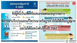 เมื่อวันที่ 2ก.ค. 2562 ผู้สื่อข่าวรายงานว่า นายปิ่นสาย สุรัสวดี โฆษกกรมสรรพากร เปิดเผยว่า ตามที่มีข่าวเผยแพร่ในสื่อสังคมออนไลน์ เรื่องการปฏิรูปภาษีสรรพากรแบบใหม่ทั้งระบบ พร้อมระบุว่า จะนำมาปรับใช้ในปี 2562 ข้อความที่เผยแพร่เป็นเพียงข้อเสนอแนะ ของคณะอนุกรรมการพิจารณาปรับปรุงแก้ไขประมวลรัษฏากรที่ได้มีการนำเสนอในการจัดสัมนา เมื่อวันที่ 21 กันยายน 2561ที่ผ่านมา ซึ่งปัจจุบันกรมสรรพากรอยู่ระหว่างศึกษา.. ดูเพิ่ม