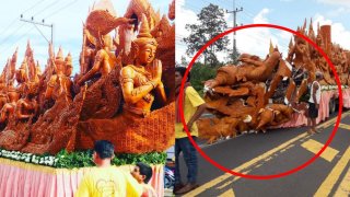 แทบใจสลาย!! เมื่อรถขบวนเทียน เกิดอุบัติเหตุ จนต้นเทียนพังเสียหาย ก่อนเข้าประกวด