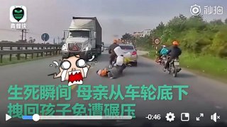 ระทึก!! แย่งลูกกับความตาย! มอเตอร์ไซค์ล้มเด็กไถลเข้าใต้ท้องรถบรรทุก แม่คว้าตัวทันเฉียดฉิว