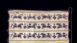 (For English, please scroll down.)ผ้าห่อคัมภีร์โบราณพบที่รัฐฉาน ในประเทศพม่า จากลักษณะงานทอบนผ้าสันนิษฐานว่าน่าจะเป็นของกลุ่มไทเขินหรือไทลื้อที่อาศัยอยู่ทางตะวันออกเฉียงใต้ของรัฐฉาน วัสดุที่ใช้คือฝ้าย ทอลวดลายด้วยวิธีการขิดเป็นรูปม้าเรียงกันเป็นแถว นอกจากนั้นยังมีการใช้แกนไม้ไผ่ทอสอดเข้าไปในผืนผ้าเป็นช่วงๆสลับกับลวดลายขิด แกนไม้ไผ่เหล่านี้ช่วยให้ผ้าห่อคัมภีร์มีความแข็งแรงและอยู่ทรงมากขึ้นเมื่อนำไป.. ดูเพิ่ม