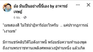ล่าสุดทางอ.เจษฏา ก็ได้ออกมาโพสเกี่ยวกับเรื่องนี้ว่า.. "เมฆสองสี ไม่ใช่ปาฏิหาริย์อะไรครับ .. แค่ปรากฏการณ์ "เงาเมฆ" มีการแชร์คลิปวิดีโอดังภาพนี้ พร้อมข้อความทำนองพูดถึงงานพระราชทานเพลิงศพหลวงปู่ท่านหนึ่ง แล้วเกิดปาฏิหารย์ในงานพิธีประชุมเพลิงหลวงปู่ คือ เกิดปาฏิหารย์ "เมฆสองสี" ขึ้น เพื่อเป็นกำลังใจศิยานุศิษย์ ให้มั่นคงในคุณพระรัตนตรัย ดูวาระสุดท้ายหลวงปู่ เป็นพยานความดี !? ซึ่งเรื่องนี้ ซึ่งก็เป็น.. ดูเพิ่ม