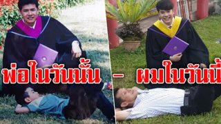 ลูกชายโพสต์รูปรับปริญญา เมื่อก่อนเคยนอนรอคุณพ่อวันงาน 16 ปีต่อมา คุณพ่อนอนรอเเสดงความยินดีให้ไม่ต่างกัน