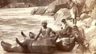 ในช่วงต้นทศวรรษ 1900 เจมส์ ริคัลตัน ครูโรงเรียน นักเดินทาง และช่างภาพชาวอเมริกัน เดินทางไปอินเดียและเดินทางอย่างกว้างขวางทั่วทั้งอนุทวีป บันทึกภาพและบันทึกชีวิต วัฒนธรรม และประเพณีของชาวพื้นเมืองผ่านการถ่ายภาพ ครั้งหนึ่งขณะไปเยี่ยมหมู่บ้านห่างไกลบางแห่งบนเนินเขาปัญจาบบนเทือกเขาหิมาลัยตอนล่าง เขาได้พบเห็นการใช้หนังวัวมาเป็นทุ่นสำหรับการข้ามแม่น้ำ เลยบันทึกภาพไว้การใช้หนังสัตว์เพื่อการเดินเป็นทุ่นล.. ดูเพิ่ม