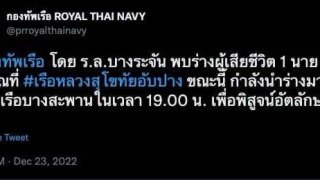 #BREAKING กองทัพเรือแจ้งข่าว พบร่างผู้สูญหาย 1 นาย จากเหตุการณ์เรือหลวงสุโขทัยอับปางเพิ่ม กองทัพกำลังนำร่างมาที่ท่าเทียบเรือบางสะพาน เพื่อพิสูจน์อัตลักษณ์ต่อไป ในเวลา 19.00 น. และเดินหน้าตามหาผู้สูญหายอีก 22 นายต่อไป ขอบคุณคลิปจาก youtube channel : TNN Online (embed) ดูเพิ่ม