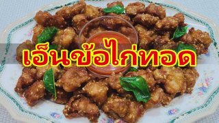 เอ็นข้อไก่ทอด ส่วนผสม 1. เอ็นข้อไก่ 300 กรัม 2 เกลือป่น 1 ช้อนโต๊ะ 3.ผงปรุงรส 1 ช้อนชา 4.พริกไทย 1 ช้อนชา 5.ซีอิ้วขาว 2 ช้อนโต๊ะ 6.ซอสหอย 1 ช้อนโต๊ะ 7.งาขาว 2 ช้อนโต๊ะ 8.แป้งทอดกรอบ 1 ถ้วย 9.น้ำครึ่งถ้วย 10.น้ำมันพืช 11.ใบมะกรูด ขั้นตอนการทำ 1. ขย่ำเอ็นข้อไก่ด้วยเกลือ 2. ล้างน้ำให้สะอาด 3.พักให้สะเด็ดน้ำ 4.ใส่ผงปรุงรส 1 ช้อนชา 5.พริกไทย 1 ช้อนชา 6.ซีอิ้วขาว 2 ช้อนโต๊ะ 7.ซอสหอย 1 ช้อนโต๊ะ 8.งาขาว 2.. ดูเพิ่ม
