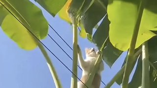 เมื่อเหมียวจะหนีเที่ยวแต่ดันเจอหมาเจ้าถิ่น วิ่งขึ้นไปหลบบนต้นกล้วยก่อน โถว!! ยังไม่ทันได้เที่ยวเลย 😆