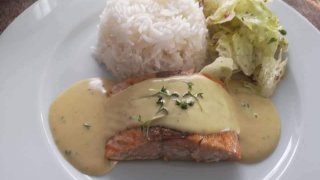 ปลาแซลม่อน ราดซอสครีมเลม่อนแกงเขียวหวาน เมนูสุดปัง