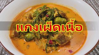 แกงเผ็ดเนื้อ ส่วนผสม 1. เนื้อวัวครึ่งกิโลกรัม 2. เกลือ 1 ช้อนโต๊ะ 3. นำมันพืช 4. พริกแกงเผ็ด 5. กะทิ 250 ml. 6. น้ำตาลทราย 1 ช้อนโต๊ะ 7. ผงปรุงรส 1 ช้อนชา 8. น้ำปลา 2 ช้อนโต๊ะ 9. มะเขือพวง 10. ใบมะกรูด 11. ชะอม วิธีทำ 1. ล้างเนื้อ ขยำเกลือ แล้วล้างให้สะอาด 2. ตั้งกระทะใส่น้ำมันพืชเล็กน้อย เอาพริกแกงลงไปผัดให้หอม 3. เติมกะทิครึ่งหนึ่งแล้วผัดให้เข้ากันแลัใส่เนื้อวัว แล้วเติมกะทิส่วนที่เหลือ 4. รอใหเ.. ดูเพิ่ม