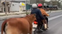 แม่วัวตัวหนึ่งวิ่งไล่ตามรถจักรยานยนต์ ที่บรรทุกลูกวัวขาหักของมันมาด้วย