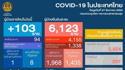 วันที่ 27 ธ.ค.63 ศูนย์ข้อมูล โควิด รายงานตัวเลขผู้ป่วยประจำวันที่ 27 ธ.ค. สถานการณ์การติดเชื้อ พบผู้ป่วยรายใหม่ 103 ราย ผู้ป่วยยืนยันสะสม 6,123 ราย หายป่วยแล้ว 4,161 ราย เสียชีวิตสะสม 60 ราย ในจำนวนนี้ เป็นการติดเชื้อในประเทศ 94 ราย ติดเชื้อในแรงงานต่างด้าว 0 ราย อยู่ในสถานกักกันที่รัฐจัดให้ 8 ราย และผู้เดินทางจากต่างประเทศไม่เข้าสถานที่กักตัว 1 ราย ดูเพิ่ม