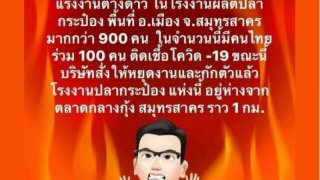 6 มกราคม 2564 จากกรณีข่าว พบแรงงานทำงานในโรงงานผลิตปลากระป๋องแห่งหนึ่งในจังหวัดสมุทรสาคร ตรวจพบเชื้อโควิด-19 พบเชื้อ 900 ราย แต่ ศบค. ยังไม่มีการรายงานข้อมูล และทางจังหวัดได้สั่งให้หยุดงานพร้อมกักตัว โดยไม่ได้เข้าสู่ระบบการตรวจคัดกรองและรักษาอาการของรัฐ และล่าสุดได้รับการยืนยันจากเจ้าหน้าที่สาธารณสุข จังหวัดสมุทรสาคร ว่าจำนวน 900 คนที่ติดเชื้อนั้นเป็นความจริง แต่มาจากการตรวจเชิงรุก 3,800 ราย ขอ.. ดูเพิ่ม