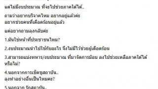 เอางบประมาณ ไปสร้างรัฐสภาได้ เอางบประมาณ ไปซื้อรถน้ำแรงดันสูงได้ เอางบประมาณ ไปซื้อตู้คอนเทนเนอร์ได้ แต่ไม่มีงบประมาณ ที่จะไปช่วยภาคใต้ได้.. ถามว่าอยากบริจาคไหม อยากอยู่แล้วค่ะ อยากช่วยคนที่เดือดร้อนอยู่แล้ว แต่อยากถามลุงกลับค่ะ 1.มันใช่หน้าที่ประชาชนไหม? 2.งบประมาณนำไปใช้กับอะไร จึงไม่มีไว้ช่วยผู้เดือดร้อน 3.สามารถแบ่งทหาร/งบประมาณ ที่มาจัดการม๊อบ ลงไปช่วยเหลือภาคใต้ได้หรือไม่? 4.นอกจากการเชิดชู.. ดูเพิ่ม