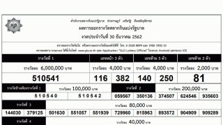 ผลสลากกินแบ่งรัฐบาลงวดวันที่ 30 ธันวาคม 2562 รางวัลที่ 1510541 รางวัลข้างเคียงรางวัลที่ 1510540, 510542 เลขท้าย 2 ตัว81 เลขหน้า 3 ตัว116, 382 เลขท้าย 3 ตัว140, 250 รางวัลที่ 2059567, 350136, 374507, 624546, 935603 รางวัลที่ 3144030, 379125, 501630, 551057, 551939, 729960, 815963, 893572, 904909, 909289 รางวัลที่ 4022940, 033032, 034930, 051650, 077124, 092527, 159432, 165747, 186851, 191526, 19299.. ดูเพิ่ม