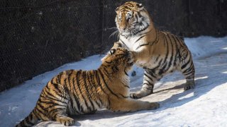 "เสือไซบีเรีย" มีความสุขกับการเล่นหิมะ ที่สวนสัตว์ ในเมืองเสิ่นหยาง ซึ่งเป็นเมืองหลวงของ มณฑลเหลียวหนิงของจีน เมื่อวันที่ 2 กุมภาพันธ์ 2021 "เสือไซบีเรีย" เป็นสัตว์ใกล้สูญพันธุ์ โดยมีประชากรประมาณ 400 ถึง 500 ตัว อาศัยอยู่ในถิ่น กำเนิดในรัสเซีย ภาคตะวันออก และ ภาคตะวันออกเฉียงเหนือ ของจีน ดูเพิ่ม