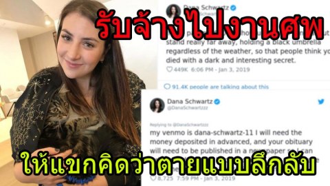 ไอเดียแปลกๆ มักเกิดขึ้นบนโลกออนไลน์ได้เสมอ เหมือนกับเรื่องราวของ ดานา ชวาทซ์ นักเขียนและนักข่าวสาววัย 26 ปี ที่เสนอไอเดียแปลกๆ ให้กับชาวเน็ต จนมีคนกดไลค์มากกว่า 4 แสนครั้ง และกลายเป็นกระแสไปทั่วทวิตเตอร์ ดานาได้ทวิตข้อความโดยยื่นข้อเสนอว่า “ถ้าคุณจ่ายเงินให้ฉัน 50 เหรียญ (1,600 บาท) ฉันจะไปปรากฏตัวที่งานศพของคุณ แต่จะยืนอยู่ห่างๆ ถือร่มสีดำโดยไม่สนว่าอากาศจะเป็นอย่างไร แล้วผู้คนจะคิดว่าคุณเ.. ดูเพิ่ม