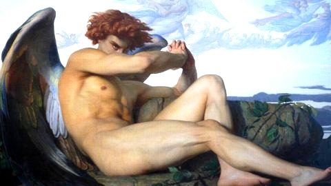 ภาพวาด Ángel caído (เทวดาตกสวรรค์) วาดโดย Alexandre Cabanel จิตรกรชาวฝรั่งเศส ปีค.ศ. 1868 เพราะลูซิเฟอร์(ยมทูต) ไม่ปฏิบัติตามพระประสงค์ของพระเจ้า และอยากเป็นพระเจ้าเสียเอง จึงถูกเนรเทศลงมาจากสวรรค์ ความโกรธ ความทรยศ ความลุกโชน ความเดือดดาล ความขบถ ปรากฏอยู่ในดวงตาของเขา Cr. Pinterest ดูเพิ่ม